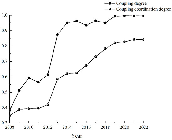 Changes in the coupling coordination degree of subsystems from 2008 to 2022.