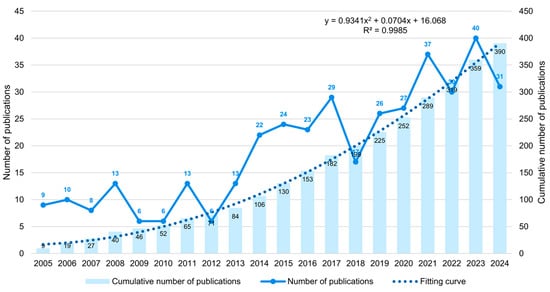 Annual publication trends in bumblebee pollination research. (The dark blue line represents annual publication volume, the light blue bars represent cumulative publications, and the blue dashed line shows the polynomial fitting curve of cumulative publications).