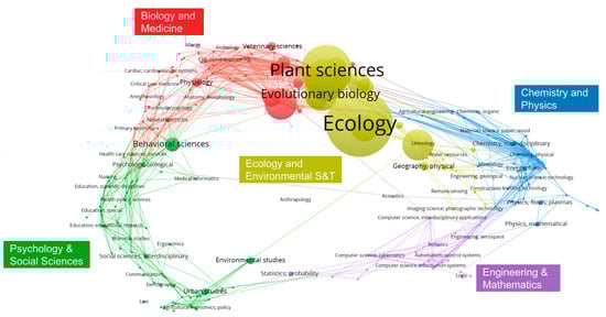 As research advances, bumblebee pollination studies are expanding into intersecting fields, such as agricultural sciences and climate change. For example, how bumblebees adapt to environmental changes under the influence of climate change has become an emerging research topic [78]. Cluster analyses further revealed that the 37 research categories can be grouped into five major domains: biology and medicine, chemistry and physics, ecology and environment, psychology and social sciences, and engineering and mathematics. Most research is concentrated in the ecology and environment domain, with limited representation in biology and medicine, indicating a relatively constrained degree of interdisciplinarity.