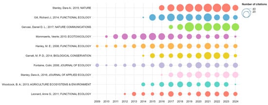 Figure 3 presents the top 10 most-cited articles and their annual citation frequencies, where the bubble size corresponds to the number of citations. The most-cited article is Stanley, Dara A., et al. (2015), published in Nature, titled “Neonicotinoid pesticide exposure impairs crop pollination services provided by bumblebees”. This groundbreaking study provided the first experimental evidence that neonicotinoid pesticides not only negatively impact bee health but also significantly diminish the pollination services provided by bumblebees. The research showed that pesticide exposure reduced the number of seeds in apples, subsequently affecting the crop quality and economic value. This article addressed a global hotspot issue related to pollinator decline and filled a critical gap in understanding the effects of pesticides on pollination services, offering theoretical and practical guidance for pesticide policies, pollinator protection, and food security research [80].