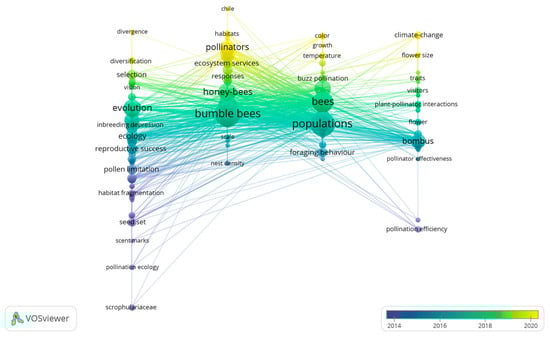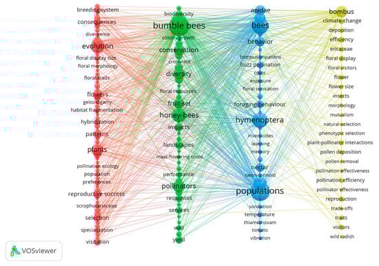 Research hotspots in pollination ecology have gradually shifted over time, from traditional topics to more complex and dynamic mechanisms. A keyword co-occurrence network analysis revealed that studies in this field primarily focus on four key directions: evolutionary ecology, pollinator behavior and population dynamics, climate change and habitat impacts, and ecosystem services and biodiversity. These directions are reflected in core keywords, such as “evolution”, “bumble bees”, “populations”, and “Bombus”, as shown in Figure 4.