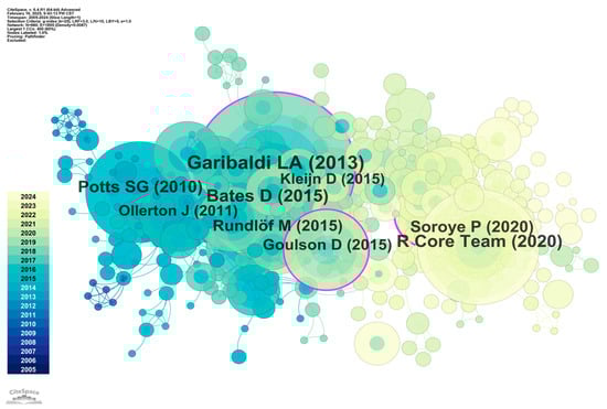 A temporal weighting analysis (Figure 5) further revealed how research hotspots have evolved over time. Between 2006 and 2016, keywords such as “seed set” and “reproductive success” dominated, reflecting a focus on pollination limitations and the importance of reproductive strategies for population maintenance (Table 2). However, in recent years, keywords like “pollinators” and “responses” have gained prominence, particularly in the context of global change. Emerging topics such as “climate change” and “habitats” highlight the profound impact of climate change on pollination networks, such as how habitat fragmentation disrupts pollination services and how global warming alters the temporal synchrony between plants and pollinators [83].