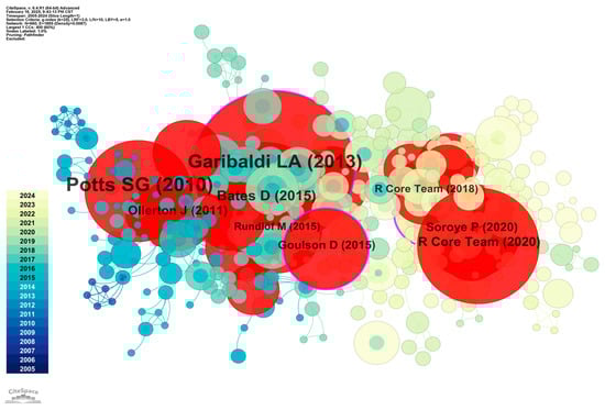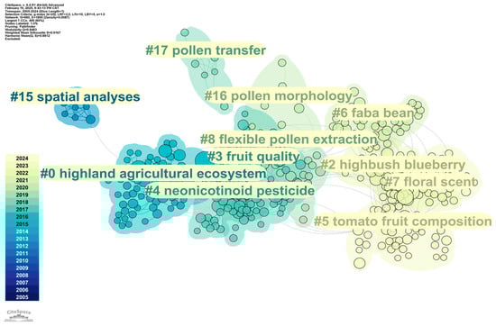 Based on the g-index (k = 25 k = 25 k = 25), 660 references were identified from the 390 articles for the co-citation and cluster analyses to explore the core knowledge and emerging hotspots in the field. Figure 6 depicts the co-citation network, with the top 10 most-cited references highlighted. The most-cited reference, Garibaldi, Lucas A., et al. (2013), published in Science, titled “Wild Pollinators Enhance Fruit Set of Crops Regardless of Honey Bee Abundance”, received 21 citations. This study innovatively synthesized data from 600 field experiments worldwide to compare the contributions of wild pollinators and honeybees to crop pollination. The results demonstrated that wild pollinators contribute more significantly to fruit set than honeybees, challenging the conventional notion that honeybees can replace wild pollinators. This finding underscored the importance of pollinator diversity for crop stability and provided actionable recommendations for integrating wild pollinator management with honeybee population strategies [54].