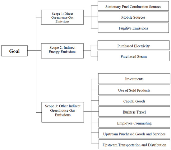 This study designs the AHP questionnaire based on the Greenhouse Gas (GHG) Protocol Corporate Standard [37], which defines Scopes 1, 2, and 3 emissions. As the previous literature has noted that insurance industries do not primarily engage in product manufacturing activities, the proportion of carbon emissions in Scope 1 and Scope 2 is relatively lower than in other industries, while Scope 3 emissions are comparatively higher. Therefore, this study combines Scopes 1 and 2 into one main criterion, alongside Scope 3, forming two primary criteria in the AHP questionnaire. Under these main criteria, this study identifies nine sub-criteria directly related to carbon-emitting activities in the insurance industry, as illustrated in Figure 2. This framework serves as the basis for designing the AHP questionnaire, which is distributed to both insurance brokers and experts from the insurance industries for completion.