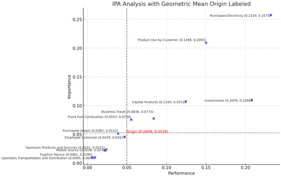 In the high importance/low performance quadrant, the use of sold products shows underperformance (0.1498 < 0.2093). It is recommended to prioritize improvements in this area, focusing on promoting low-carbon practices to reduce emissions during product use by customers. In the low importance/high performance quadrant, investments (0.2079 > 0.1099) and capital goods (0.1243 > 0.1072) indicate that resources allocated to this area could be moderately reduced and redirected to higher priority items. In the low importance/low performance quadrant, fugitive sources (0.0061 < 0.0100) and upstream transportation and distribution (0.0095 < 0.0098) both have very low importance and performance weights with minimal differences. It is suggested to maintain the current management level without additional resource investment.