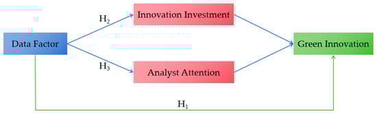 The emergence of data factors makes the information disclosure of enterprises in the capital market more timely and transparent, attracting more attention from financial media and analysts [53,54]. The theory of information asymmetry holds that in an enterprise, insiders possess more information than outsiders, which may lead to moral hazards and opportunistic behavior, resulting in inefficient corporate governance. The application of data factors effectively improves the availability of enterprise information and enhances the ability of external stakeholders to supervise the development of enterprises. The supervision of external stakeholders such as media, investors, and analysts has formed an external governance role, and thus provided an exogenous driving force for corporate green innovation. Analysts are enthusiastic about mining corporate information from disclosure reports and private channels to form analytical reports, which influence corporate decision-making. On the one hand, analysts’ attention has played a “regulatory effect”, forcing companies to innovate green. In recent years, environmental sustainability has become one of the focuses of attention in the capital market. Corporate green investment and other related information have become the focus of analysts’ attention, affecting the market value of enterprises. To avoid negative evaluations from analysts, management will restrain their opportunistic behavior and maintain or even expand the company’s green innovation investment scale. Additionally, analysts’ attention can play a “guiding effect” and promote green innovation in enterprises. Analysts’ research reports can objectively depict the policy environment and social needs to help businesses recognize the importance of green innovation. Consequently, this article posits the following hypothesis: