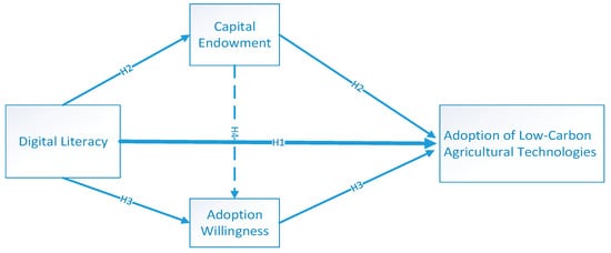 According to Bourdieu’s social practice theory, differences in social position lead actors to have varying perspectives on the same event, with their social position primarily determined by their capital endowment. From this perspective, differences in capital endowment can also influence farmers’ perceptions of adopting low-carbon agricultural technology. Additionally, resource endowment enhances farmers’ perceived ease of use by improving their cognitive abilities, agricultural production capacity, information acquisition skills, and risk tolerance, thereby strengthening their adoption willingness for new technologies [52]. Building on the previous analysis, digital literacy can influence farmers’ decision-making behavior through capability enhancement, capital accumulation, and increased willingness. Accordingly, this paper proposes the following hypothesis: