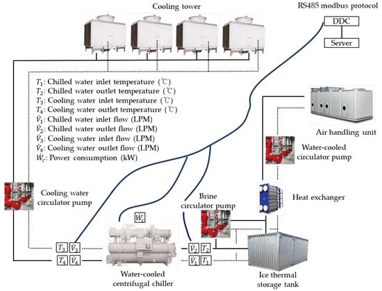 - Ice-making operation: This process involves freezing the capsule-type media in the thermal storage tank, with the chiller operating at an average design temperature of −4.5 °C. Ice is primarily stored during late-night hours, and the system halts after 10 h of operation or upon reaching 100% storage capacity;