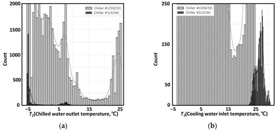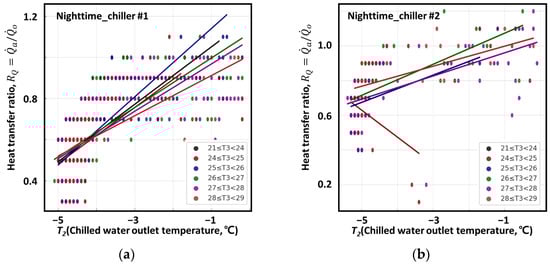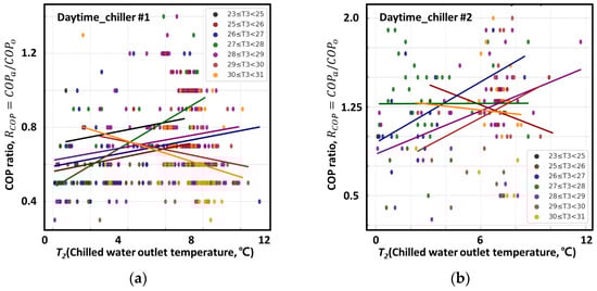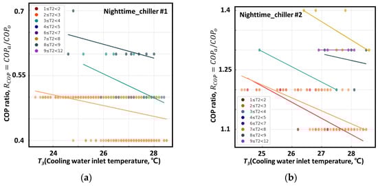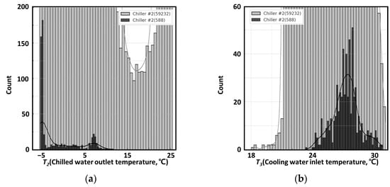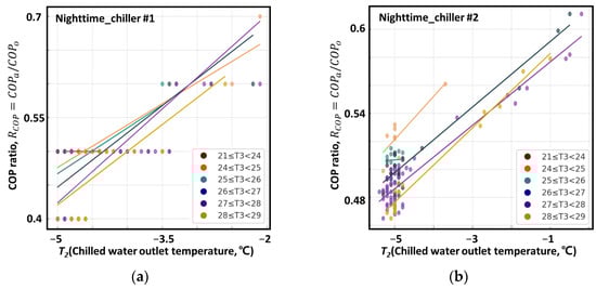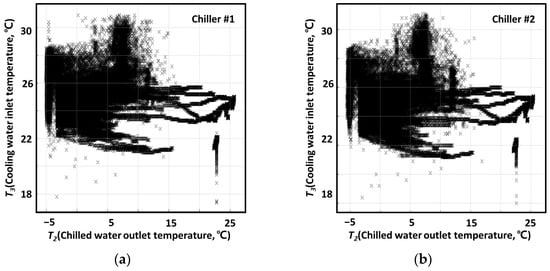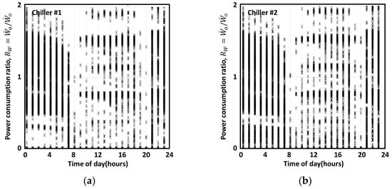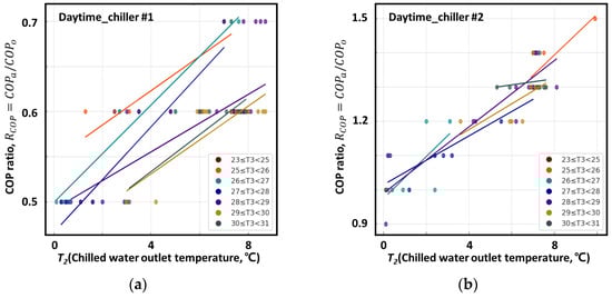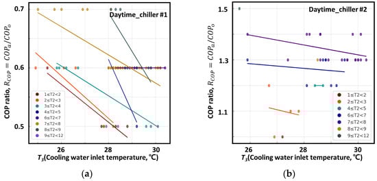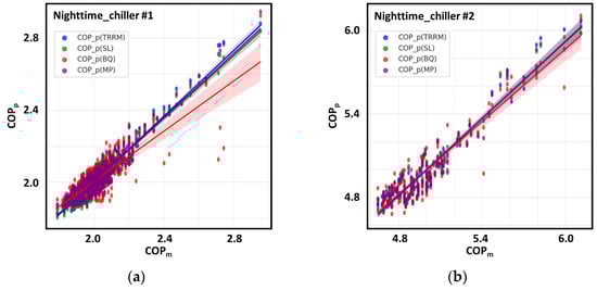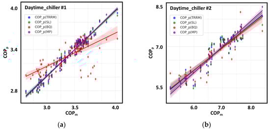 - Validation Through Data Analysis: The regression model developed using and as independent variables demonstrated strong predictive performance, with a high coefficient of determination ( > 0.8) and a low coefficient of variation of root mean square error (CVRMSE < 5%), indicating that chiller performance can be effectively modeled without incorporating PLR. Additionally, previous studies have proposed various approaches for evaluating chiller performance without using PLR [33].