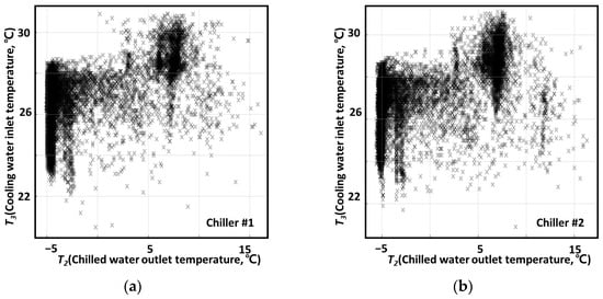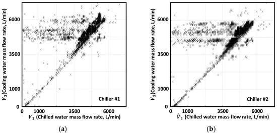 - Analysis Based on Actual Operating Data: PLR is a commonly used metric for evaluating chiller performance under partial load conditions; however, it is defined under specific design conditions and may differ from real-time operating data [29]. This study focuses on analyzing chiller performance based on actual operating data, where the relationship between , , and COP is directly examined as a more practical approach.