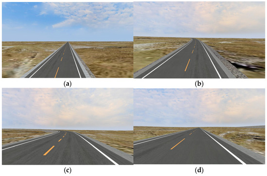 A wide, flat terrain was selected as the modeling scene to control the monotonous, consistent external environment of the road. No real-world elements in the road area significantly attracted drivers’ visual attention. The model construction only involved the geometric entity structure of the road with no traffic ancillary facilities or other landscape elements. This paper focuses on investigating the influence of the curve radius on drivers’ visual search behavior; therefore, it is necessary to restrict the turning direction of the horizontal curves. Hence, left-turning horizontal curves are taken as the research objects. The alignment index design strictly followed the relevant technical standards in the field of road traffic in China. The horizontal curve radius values included the range from the limit minimum radius to the minimum radius without superelevation in the Highway Route Design Specifications (JTG D20-2017, hereinafter referred to as the ‘Specifications’) [33] at the design speed of 60 km/h to cover the working conditions existing in engineering practice comprehensively. To ensure that drivers had a longer driving distance on curve sections, the model adopted a longer horizontal curve length design scheme to meet the requirements of the ‘Specifications’. The lengths of straight road sections between curves were above 500 m. Moreover, according to the typical design working conditions in engineering practice, a route turning angle matching the radius size was adopted to avoid visual incongruity. Other indicators such as road longitudinal slope and road width were implemented according to the standards of a two-way two-lane highway with a design speed of 60 km/h.