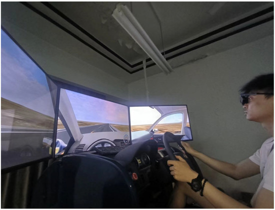 A six-degree-of-freedom virtual simulation experiment platform for vehicle performance was used to conduct simulated driving experiments. This platform was modelled based on UC-win/Road software and supported movement in six degrees of freedom in space. This platform can effectively simulate the actual operating conditions of vehicles on the road, as shown in Figure 2. The simulated driving field of view was composed of three independent screens of the same size (size: 961 mm × 567 mm × 55 mm). The vertical viewing angle of the three-screen hardware was 28°, and the horizontal viewing angle was 150°. The wide field of view can strongly replicate the real traffic scene and provide drivers with ample visual space.