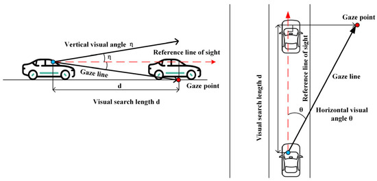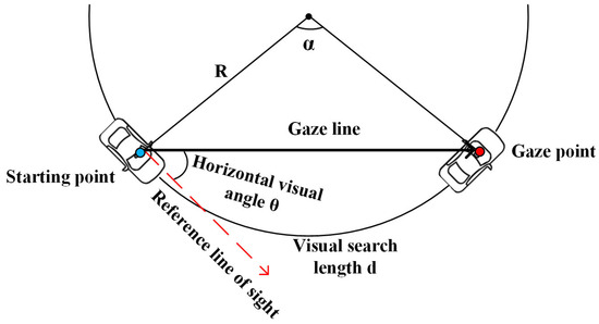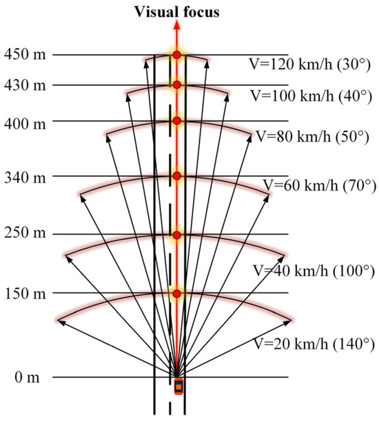 Drivers primarily perceive and obtain traffic information through binocular vision. On this basis, they make driving decisions and perform driving behaviors to ensure driving safety. Studies show that up to 90% of traffic accidents are caused by human factors related to drivers [1], and the information obtained through vision accounts for more than 90% of all information during driving [2,3]. This finding highlights that vision is the most important sensory function for drivers, and effective visual information search patterns are required to identify potential traffic risks [4]. The visual area that a person with normal vision can see in a scene is called the field of view, which is determined by the physiological structure of the eye and environmental factors [5]. Whilst driving, influenced by the road environment, the driver forms a specific visual search area (VSA) based on his/her field of view. The VSA is generally smaller than a driver’s physiological maximum field of view and encompasses the most important information elements of the road environment. The VSA is a crucial foundation for drivers to assess driving risks and make driving decisions, and it is a key factor in road geometric design and traffic sign placement. Andersen et al. proposed the concept of useful field of view (UFOV) based on the response characteristics of participants regarding 2D plane information on a computer screen [6]. They defined UFOV as the 2D spatial range determined by a driver’s visual angle, where any information falling within the UFOV, regardless of distance, is processed, whereas visual information outside the UFOV is ignored. According to driving experience, the visual information search area is a 3D space comprehensively constructed by a driver’s longitudinal visual search length, horizontal search angle, and vertical search angle. Its range is affected by the road environment and is closely related to factors such as vehicle speed. It has the characteristics of dynamic changes. The 2D static UFOV cannot reflect a driver’s real visual information search area [7] and the dynamic response characteristics of his/her visual search behavior to the road environment [8]. Amongst the 3D metrics of longitudinal search length, horizontal search angle, and vertical search angle, the first two are the core indicators for measuring a driver’s visual information search range and are the most sensitive to changes in vehicle speed and road environment [9,10]. Therefore, this paper investigated the characteristics of drivers’ visual search length and horizontal search angle.