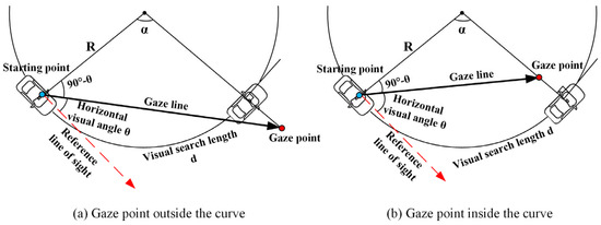 Dynamic VSA during driving is defined as the 3D field of vision space range that a driver can observe whilst keeping the head still during natural driving under the normal, stable operation state of the vehicle. Dynamic VSA is not only affected by a driver’s physiological and psychological factors but also closely related to the characteristics of the road area environment. Dynamic VSA is an important window for characterizing human factors such as a driver’s visual information search efficiency, attention allocation, and visual interest area. Dynamic VSA affects the driver’s awareness and response to road traffic operation risks. Dynamic VSA is the precursor of driving behavior decision making and has important reference value for road alignment design, traffic sign layout, and landscape planning. As one of the key indicators for constructing the driver’s dynamic VSA, visual search length is defined in this paper as the driving distance between the perpendicular foot from the driver’s fixation point at a certain moment to the centerline of the road and the driver at that moment. Horizontal search visual angle refers to the angle between the driver’s line of sight at a certain moment and the reference line of sight when the driver looks straight ahead with both eyes. Figure 4, Figure 5 and Figure 6 show schematic diagrams of drivers’ VSA on straight and curved road sections. When the driver aligns the fovea centralis of both eyes with the target object, so that the reflected light is refracted by the lens, imaged on the retina, perceived by the optic nerve and transmitted to the brain, this process is fixation. In this paper, a gaze point dwell time of 100 ms was used as the conditional threshold for fixation [35,36].