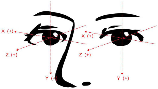 According to Hering’s law, the movement of human eyes can only be conjugate or symmetrical. If the movement law of one eye is analyzed, the movement of the other eye can be obtained [37,38]. Based on the vector coordinates of the driver’s eyes, the horizontal search angles of the line of sight of both eyes at a certain moment were calculated in this paper, and the average was taken as the angle analysis value to minimize errors to the greatest extent. Assuming that the line-of-sight vector coordinates of the driver’s left and right eyes at moment i are (, , ) and (,, ), respectively, then the horizontal search angle θHi is calculated as follows: