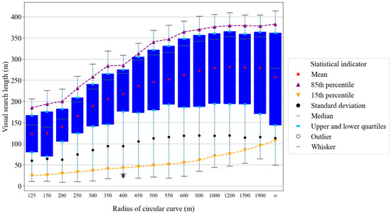Box plot of drivers’ visual search length on horizontal curve sections with different radii.
