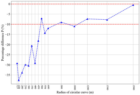Figure 10 shows that the smaller the radius, the greater the absolute value of |P|. As the radius increases, the absolute value of |P| generally decreases. This outcome further reflects the constraining effect of curve curvature on search length. The smaller the radius and the greater the curvature, the smaller the road range covered by the driver’s sight. At this time, the projected length of the curve in the direction of the driver’s sight is smaller. Under the same search angle, the driver’s gaze point can only focus more frequently on the proximal area of the curve to obtain road information. Therefore, the search length is shorter than that of a straight road section at the same speed level. Due to the limitation of visual information acquisition, the driver can only choose a lower vehicle speed. When R ≥ 1200 m, the absolute value of |P| can be stabilized within 10%, indicating that defining DV3S-R as 1200 m is reasonable. Consequently, it can be discerned that when a driver is navigating a horizontal curve segment where the radius attains or surpasses the DV3S-R, the constraint on the visual search length imposed by the curvature can be disregarded. In such a scenario, there exists no substantial disparity from a straight section, and the speed-selection behavior likewise attains a state congruent with that on a straight section.