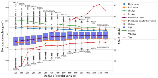 To show the distribution characteristics of the driver’s horizontal search angle on the horizontal curve sections intuitively, a box plot was drawn, and the mean values and 85th percentile values of the left- and right-biased search angles, as well as the mean value and standard deviation of the overall search angle, were marked. The percentages on the upper and lower boundaries are the proportions of left- and right-biased fixation points on road sections of different radii. Moreover, to reflect the driver’s speed level on different road sections, the V85 for each curve was calculated and superimposed on the box plot in the form of a double y-axis graph, as shown in Figure 11.