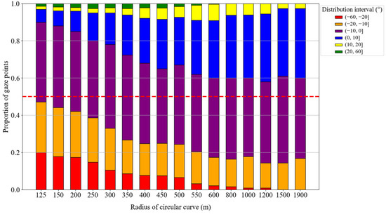 To explore the distribution characteristics of the driver’s gaze point further, a percentage stacked column chart of gaze points in different intervals under different radii is shown in Figure 12.
