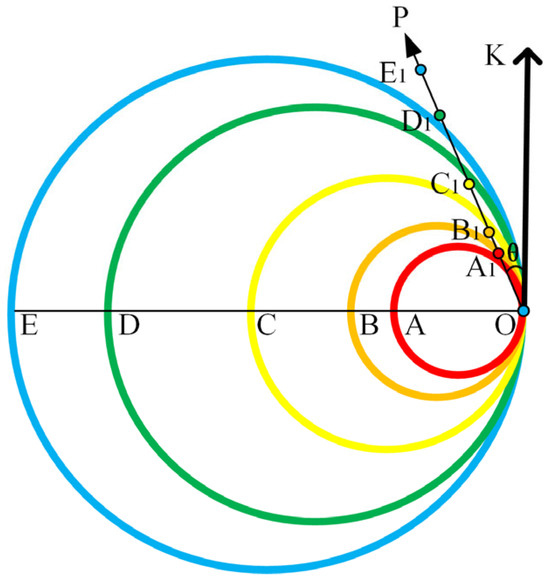 In Figure 14, the red area represents the inside of the curve, which is the main VSA for the driver, and the blue area is the outside of the curve, which is the secondary VSA for the driver. HA stands for horizontal angle. The driver’s longitudinal visual search length increases with an increase in the radius of the horizontal curve, the lateral visual search breadth, that is, the horizontal search angle, decreases with an increase in the radius, and the speed increases with an increase in the radius. This speed selection behavior characteristic of the driver may be affected by the differential constraint of horizontal curves of different radii on his line of sight. As shown in Figure 15A–E are horizontal curves of different radii. OK is the driving direction of the driver at time t, that is, the tangent direction of different horizontal curves. O is the TP, that is, the gaze point position of the driver at a certain time t. OP is the line of sight of the driver at time t. θ is the horizontal search angle. A1, B1, C1, D1, and E1 are the gaze points of the driver on different horizontal curves. Under the same horizontal search angle condition, as the radius increases, the smaller the degree of deviation of the road from the driving direction, the higher the proportion of the road in the driver’s field of vision, the larger the range of road environment that his line of sight can search, and the richer the visual information that can be observed and obtained. According to eye–brain theory in psychology [41,42], the gaze point target of the human eye and the cognitive activities of the brain are synchronous. The information acquisition of both eyes is the leading foundation of brain behavior decision making. The driver must fully evaluate the road driving conditions through effective visual search and must obtain sufficient forward-looking visual information in a specific road environment to make a safe, reasonable speed decision. The larger the radius, the wider the driver’s visual search coverage and the more sufficient the information, which lays an important foundation for selecting a higher driving speed and is needed to drive at an increased speed.