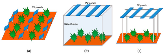 Kavga et al. [38] cultivated pepper in a greenhouse with 20% of its roof covered with opaque poly-Si PV modules. The pepper fruits’ weight, size, and thickness were roughly the same between the AV greenhouse and the control one. Moreover, there were no statistically significant differences in the phenolic content or antioxidant and antiradical activities of fruits from the two greenhouses, showing that slight shading does not affect the growth of peppers. Temperatures were basically the same between the AV and the control greenhouse (covered in glass), and overall, the total crop yield was slightly higher in the AV greenhouse.