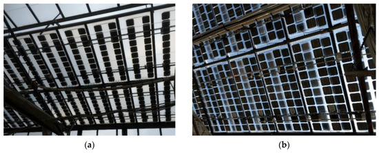 Greenhouse roof with (a) fixed STO modules (33% shading) and (b) mobile STO modules (66% shading). Adapted from [27] licensed under CC-BY 4.0.