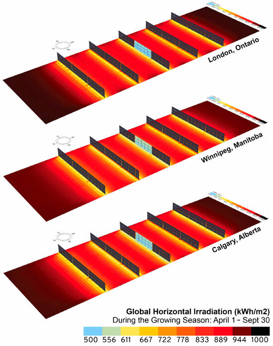Jamil et al. [52] proposed a numerical simulation performed in Ladybug on an arable field with interspersed rows of vertically mounted PV modules at different distances. The goal of the simulation was to calculate the irradiance on the ground and then identify crops whose light needs were compatible with the light intensity reduction caused by the PV modules. The PV modules considered were bifacial and aligned along the N-S axis, meaning they faced E-W. The simulation was conducted with three different spacings between the rows—5 m, 15 m, and 45 m—across three different regions in Canada: Ontario, Manitoba, and Alberta. The analysis covered the April–October period, which is considered growing season in Canada. The number of crops compatible with the AV system was sixteen for Ontario, four for Manitoba, and seven for Alberta when the AV system had a row spacing of 15 m or 45 m. The simulation suggests that large-scale implementation of this kind of AV system in Canada could generate up to 532 TWh/y, which is more than 84% of Canada’s yearly energy consumption of 632 TWh. The inclusion of wheat fields in AV applications could significantly boost this potential. Figure 6 shows the cumulative irradiance levels for a 15 m spacing between the modules.