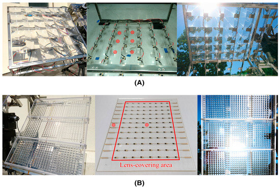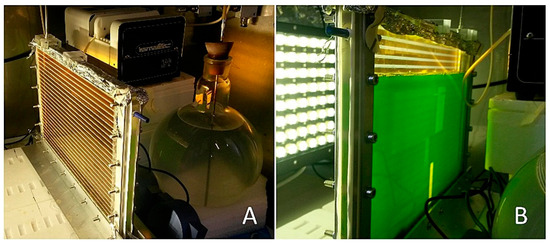 View of the photobioreactor covered with a DSSC from the (A) front and (B) back. Re-used with permission from [63].