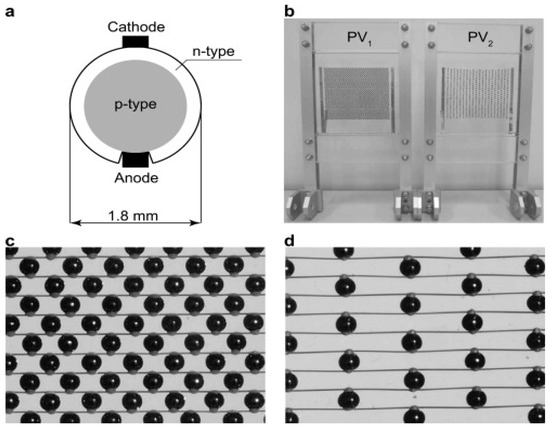 (a) Spherical microcell schematics: (b) microcell PV modules; (c) microcells in the high-density configuration; (d) microcells in the low-density configuration. Reprinted from [14] licensed under CC-BY 3.0.