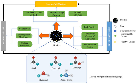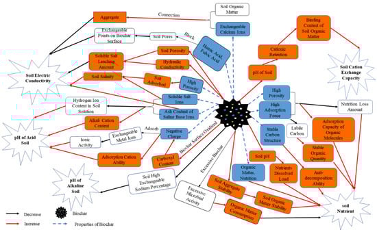 Despite the substantial amount of research exploring the impact of biochar on the physicochemical properties of soil, these studies often focus on specific crops or soil types, meaning that a comprehensive analysis of the broader applicability of biochar under different environmental conditions is lacking. Additionally, the specific mechanisms by which biochar affects the characteristics of soil remain unclear, leading to an insufficient understanding of its applications. This review aims to fill the following research gaps: on the one hand, the aim is to systematically assess the comprehensive effects of biochar on different soil types; on the other hand, the aim is to analyze the physical and chemical mechanisms of biochar in depth to reveal its potential mechanisms for improving soil’s properties (Figure 1). By integrating the latest experimental results, we hope that this study will provide a theoretical foundation for future research and offer scientific justification for the broader application of biochar. The purpose of this paper is not only to review the existing literature relating to biochar but also to provide a comprehensive overview to promote its application in the context of sustainable agricultural development. Understanding the multidimensional impacts of biochar on the physicochemical properties of soil will aid in the formulation of more effective soil management strategies and advance the development of ecological agriculture.