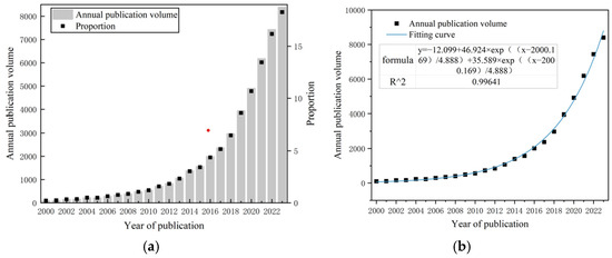 The annual number and percentage of papers published from 2000 to 2023 (a) with a nonlinear fitting displayed (b).
