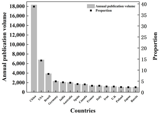 The majority of the retrieved results (96.713%) were in English (Table 2), while there were significantly fewer publications in Chinese (28, 0.065%). However, papers published from China made up 38.771% of all publications (Figure 3), totaling 18,336 papers. The USA followed closely behind with 6788 papers, accounting for 14.353% of all papers. All other countries collectively contributed <10% of all published papers.