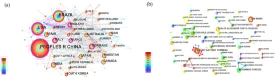 The co-occurrence map of research countries (a) and authors (b) studying the effects of biochar on soil’s physical and chemical properties from 2013 to 2023.