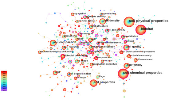 The publication time of keyword co-occurrence of research on the influence of biochar on soil’s physicochemical properties from 2013 to 2023.