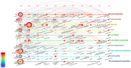 A visualized keyword timeline was created using annual time slices based on keyword clusters (Figure 5). The numbers on the right side of Figure 6 correspond to the keyword cluster numbers, and the timeline chart details the emergence of various keywords in clusters and their correlation with research trends in the field. Research topics such as soil’s bulk density, organic matter in soil, crop yield, and soil microorganisms emerged relatively early, while studies on soil’s pH, enzyme activity, and effective water content appeared later. Overall, the research output on the impact of biochar application on soil’s physical and chemical properties has remained consistently high.