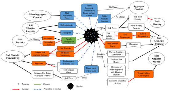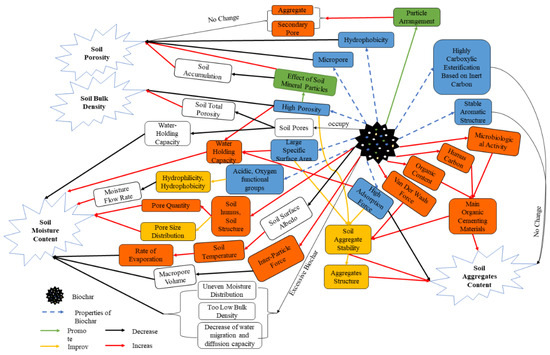 The main physical indicators of soil properties are the soil’s porosity, bulk density, moisture content, and aggregates. The soil porosity is a metric of the soil’s structure and pore conditions, which play important roles in plant root growth and nutrient absorption. The bulk density of soil is the mass (or weight) of undisturbed soil per unit volume [4]; it characterizes soil’s ecological function and serves as an indicator of its quality [5,6]. An excessive bulk density can reduce aeration in the soil, impede nutrient transformation, and adversely affect crop growth. The soil’s moisture content is important in agricultural production, with the two most important metrics being its saturation capacity and field water holding capacity. Soil aggregates indicate the soil’s fertility, and their stability is a key factor in soil’s structure and erosion resistance [7]. Fertility can be evaluated using the aggregate mean weight diameter, geometric mean diameter, and fractal dimension, which significantly influence the ecological functions of flora, fauna, and microorganisms. The effects of biochar application on soil’s physical properties are illustrated in Figure 7.