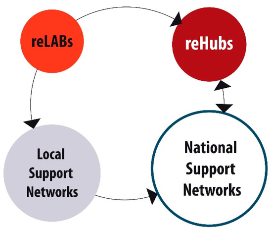The re-MODULEES project put forward a multi-actor perspective aimed at triggering a stakeholders’ community-building process spanning across the whole market SVC, and turning the classic approach based on users, platforms, and contents into a new paradigm focused on community, usefulness, and results. To this end, the re-MODULEES project activated a renovation Local Advisory Board (re-LAB) in each pilot market, composed by stakeholders’ representatives of all the four market sides addressed, acting as “umbrella” actors for a wider engagement process. re-LABs were at the core of the transition pathways: as a testbed, they could effectively steer a capitalization process by testing, co-creating, and validating innovative solutions, and by extending their outreach across the market; as knowledge insiders, they could provide valuable knowledge about the specificities and uniqueness of local markets; as strategic acceleration points, they could co-develop activities aimed at maximizing the impact of the project outputs at the local level. Finally, as network catalyzers, they could play a key role in building up support networks at local and national levels. A total of 125 stakeholders were involved in the re-LABs during the project activities (33 for the demand, 43 for the supply, 19 for the financial, and 30 for the institutional sides, respectively), representing a wide range of actor typologies, such as associations of professionals or building owners, companies, federations, institutional clusters, NGOs, etc. In this way, each actor onboarded in the re-LAB had the potential to serve as an aggregator (or “umbrella member”) for a larger number of smaller actors in their markets. While these stakeholders had previously experienced fragmentation and segmentation within their market dynamics, the fruitful interaction enabled by the re-LABs allowed turning such a pattern of “disaggregated data and experiences” into a new pattern of “aggregation platform and communities”. In turn, community creation proved to be seminal for the successive establishment of a new type of market actor, namely the “renovation HUBs” (re-HUBs), intended to ensure continuity with the transition process after the end of the project, by taking over the task of operating the market activation platform (MAP) within their markets. Re-HUBs are multi-actor and multi-level strategic networks, conceived on the one side as aggregators of local SVCs, and on the other side as local branches of a wider, trans-national cooperation framework. In this sense, re-LABs also acted as incubators for the establishment of re-HUBs, thanks to the signature of formal agreements among partners and stakeholders. Figure 2 shows the interactions between the different entities established in the project.