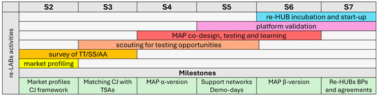 Scheme of the Standard Action Plan (SAP) describing the lines of action and the correspondent milestones (S = semester of project implementation, CJ = Customer Journey, TSAs = tools, services, and applications, MAP = market activation platform).