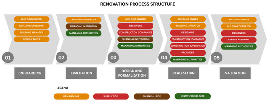 - Renovation Process Structure (RPS): this represents the succession of phases and the connections of actors involved in each phase, of the deep renovation process (Figure 4). The renovation process is made up of the connections and the networks established among these actors. Both the actors and the RP phases list, as derived from the clusterization process, should be considered shared across the pilot markets, thereby forming a reference framework for their comparison. The RPS is organized according to the phases of the renovation process, where different actors play a role. The actors are mentioned in each RP phase with different colors according to the category corresponding to a market side: supply, demand, public, and financial (see the legend in the figure).