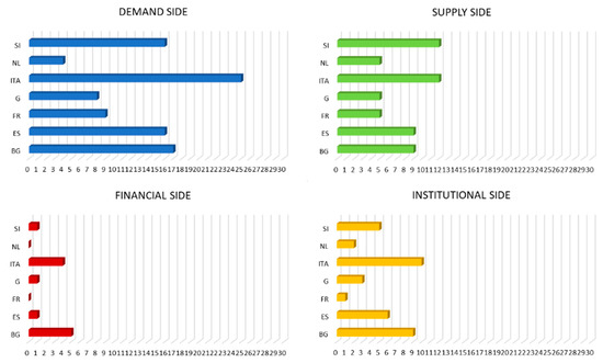 Although there are some differences among ecosystems depending on geographic, social, and political characteristics, it is evident from the graphs in Figure 5 that constraints in renovation markets are in greater numbers on the demand side. This side is the one that basically starts the innovation process involving the other market sides Consequently, the numerous constraints affecting this side slow down renovation market evolution. The supply side also faces many constraints, with differences for ecosystems based on the maturity of technical knowledge and organizational capacity with often low-skilled workers. The institutional and financial sides, however, are affected by constraints hindering their ability to trigger renovation.