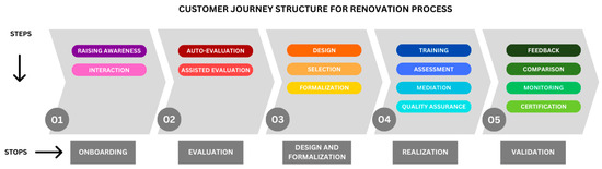 The re-MODULEES project identified and analyzed a large number of innovation resources from European initiatives at different scales, highlighting potential interconnections among them. This required first developing a Customer Journey (CJ), which further refined the RPS in Figure 4 by adding 15 steps so as to describe the renewal process in greater detail (Figure 6) and facilitate comparisons among the selected tools.