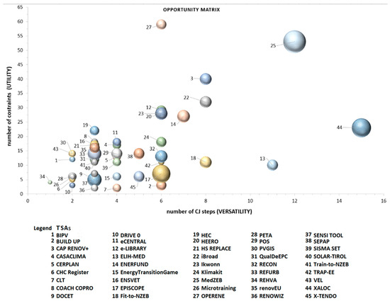 The findings about constraints were used to populate an opportunity matrix, highlighting untapped market potential as well as market limitations and barriers in relation to the capitalized innovative tools, services, and applications (TSAs). This matrix (Figure 6) is the outcome of the capitalization pathway described in the following Section 3.3.