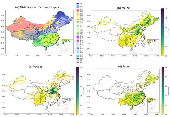 Climate types and distribution of major crop cultivation in China. (a) Distribution of climate types; (b) maize; (c) wheat; (d) rice. (first letter—A: tropical, B: dry, C: mid-temperate, D: snow, E: polar; second letter—f: humid, m: monsoon, s: dry summer, w: dry winter, W: desert, S: steppe, T: tundra, F: frost; third letter—h: hot arid, k: cold arid, a: hot summer, b: warm summer, c: cool summer, d: cold summer).
