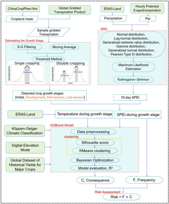 The Savitzky–Golay filtering method was first applied in this study in combination with a moving average approach to smooth the time-series data of the global grid transpiration dataset. A threshold-based method was then utilized to identify critical periods of stable water demand, thereby delineating distinct crop growth stages. Next, SPEI was computed for different regions in China across each growth stage, providing a quantitative measure of drought and wetness conditions as a key climatic variable for subsequent modeling. An XGBoost model was then constructed to quantify the impact of extreme drought and extreme wetness conditions on crop yield at various growth stages. The model incorporates SPEI values during each growth stage, mean temperature during each growth stage, elevation data, and climatic regionalization information as feature variables, with crop yield serving as the target variable. Partial dependence plots (PDPs) were generated to illustrate how crop yield responds to variations in drought and wetness conditions throughout different growth stages. Finally, a disaster risk assessment model was implemented by integrating the yield reduction rates estimated with XGBoost with the historical probabilities of drought and wet events. This approach enables a comprehensive evaluation of the potential risks posed by extreme climatic conditions to the yield of major grain crops in China. This study provides a robust scientific framework for optimizing agricultural management, developing disaster mitigation strategies, and enhancing the sustainability of crop yields. The research framework is illustrated in Figure 2.