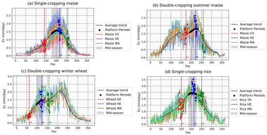 To enhance the spatial consistency of the analysis, 1 km resolution data from the crop planting dataset were aggregated to 0.1°, with a focus on regions where the planting proportion exceeded 60% at 0.1° resolution. The vegetation transpiration data (Ec) for these regions were subsequently analyzed, and a threshold-based method was employed to identify the critical period during which crop water demand remained stable. This stable phase of transpiration, referred to as the platform period, was used to define the mid-season stage of the crops (as shown in Figure 3). In essence, the development and late-season phases in this study were determined based on the crop’s progression relative to the platform period and its growth stages before and after.