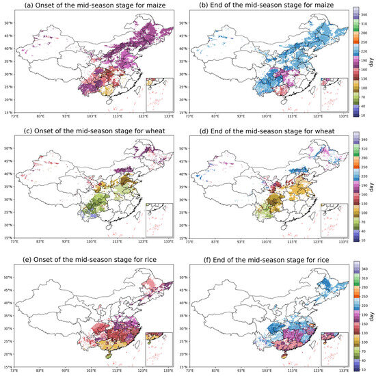 Spatial distribution of the onset and end of the mid-season stage for major crops in China ((a) onset of the mid-season stage for maize; (b) end of the mid-season stage for maize; (c) onset of the mid-season stage for wheat; (d) end of the mid-season stage for wheat; (e) onset of the mid-season stage for rice; (f) end of the mid-season stage for rice).