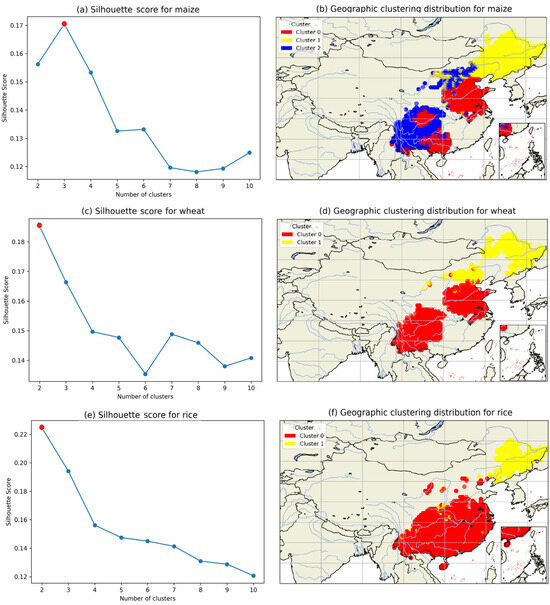 The left panel of Figure 5 presents the silhouette scores across a range of cluster numbers (from 2 to 10). Higher silhouette scores for wheat and rice were observed with fewer clusters, indicating better clustering performance. However, as the number of clusters increased, the silhouette scores gradually decreased, suggesting a deterioration in clustering quality. The silhouette scores initially increased for maize but then decreased, and the overall scores were relatively low, indicating that the clustering performance for maize was poorer than that for wheat and rice.