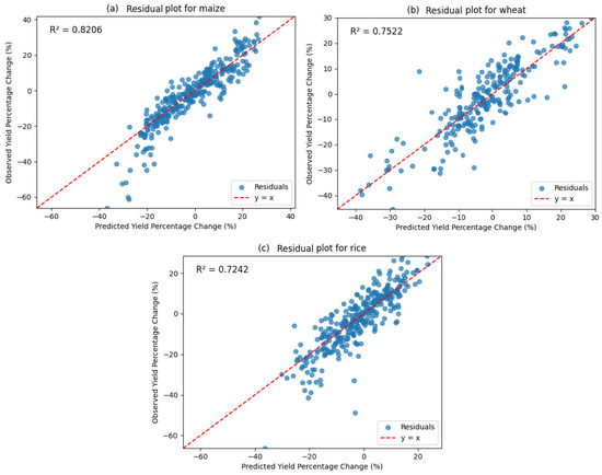 Residual scatter plots of the observed and predicted values from the XGBoost model ((a) residual plot for maize; (b) residual plot for wheat; (c) residual plot for rice).