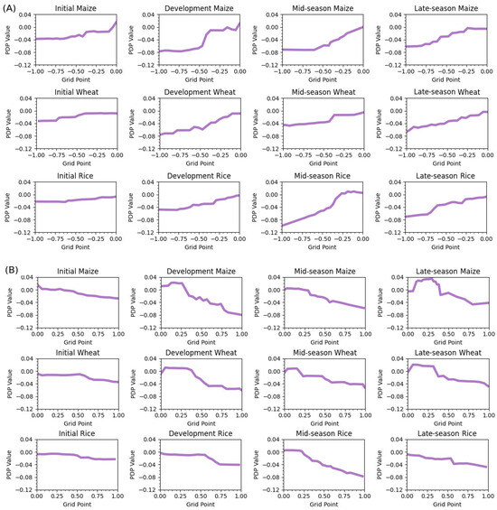 Partial dependence plots showing the effects of extreme drought (A) and extreme wetness (B) on different crop growth stages.