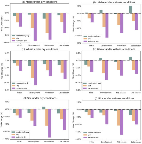 This study makes a significant contribution by systematically analyzing the responses of major crops in China to climate stressors, such as drought and extreme wetness, across different growth stages. The impacts of water-related disasters, including droughts and extreme wetness, on crop yields at various growth stages were evaluated in this study by employing high-resolution phenological data and precise delineation of crop growth stages. Additionally, a comprehensive regional risk assessment was conducted. This research highlights the distinct sensitivities of each crop to drought and extreme wetness, providing critical scientific insights to inform future agricultural water management and climate adaptation strategies.